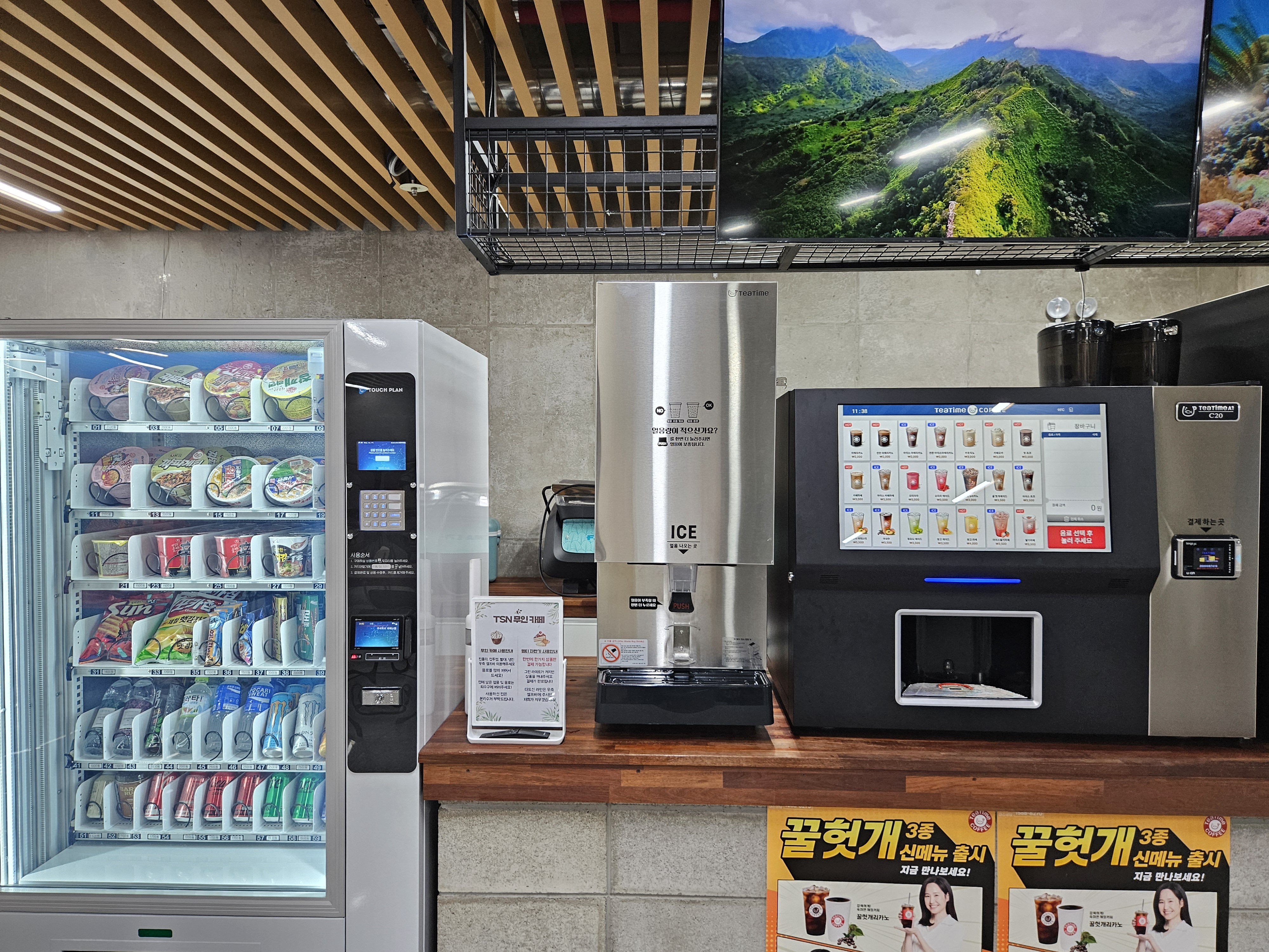 1층에 간단히 즐길 수 있는 라면 자판기와 커피머신이 있습니다.